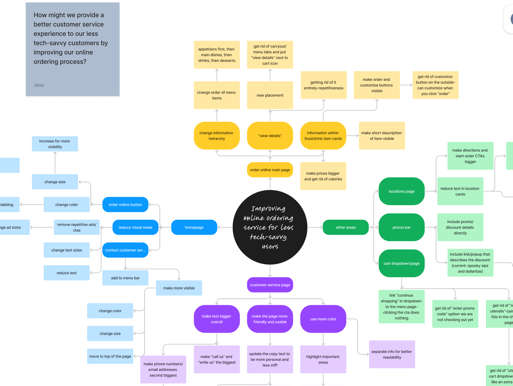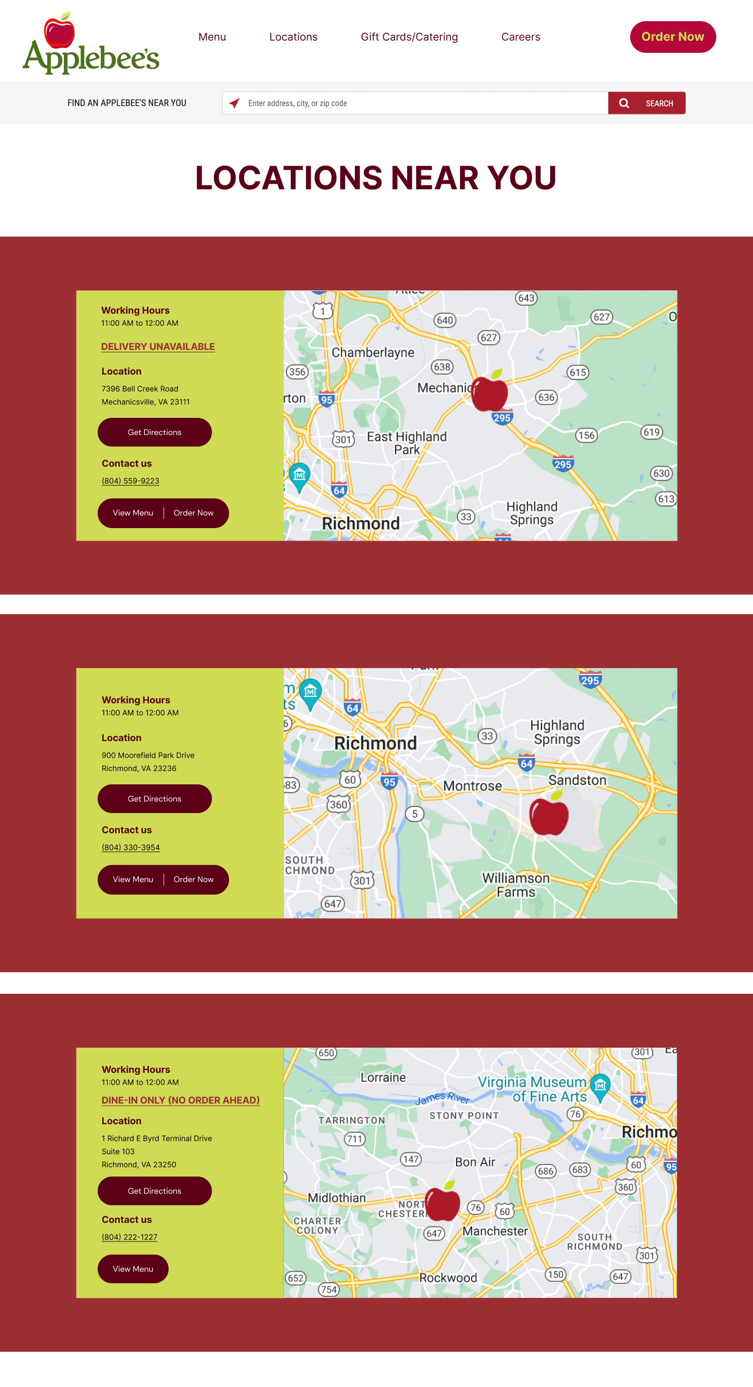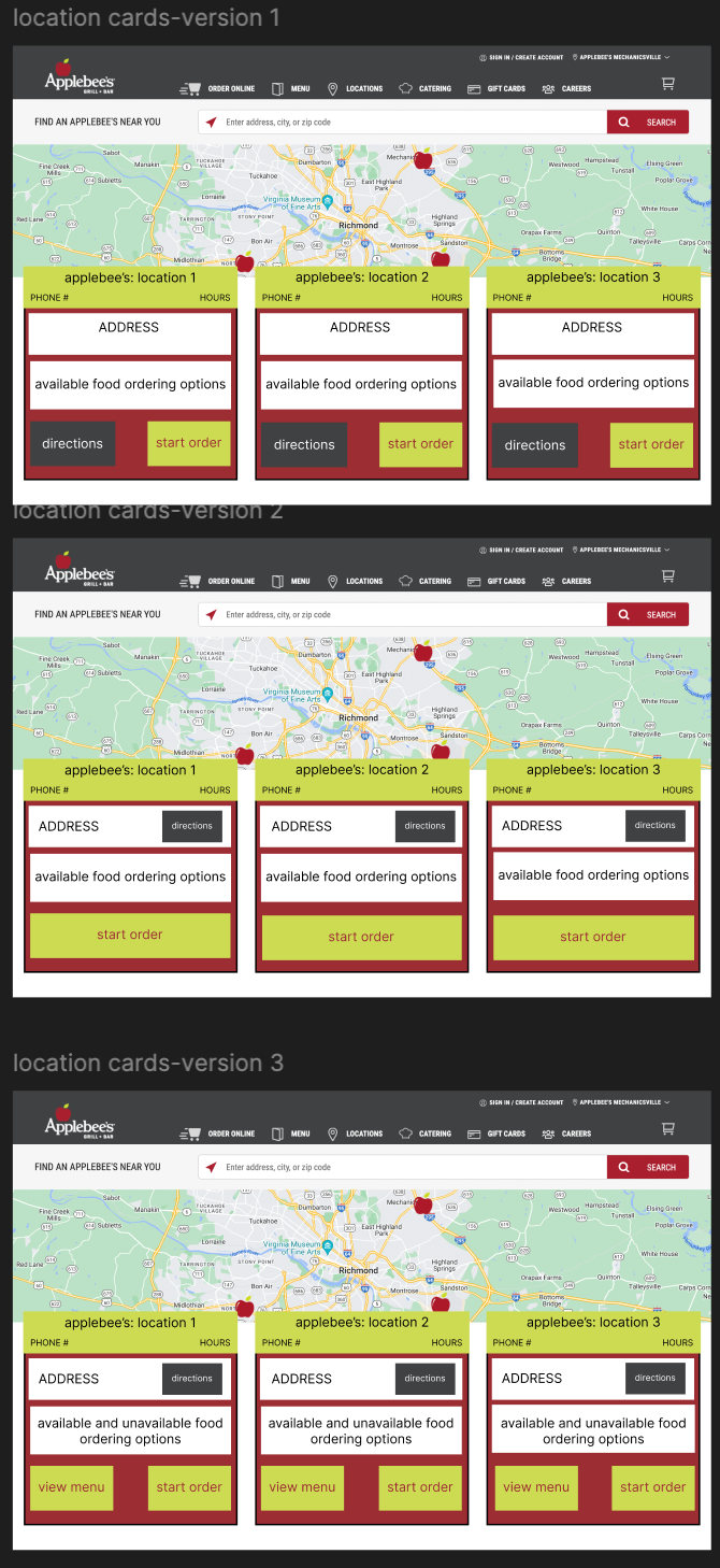 For this project, I recorded a video showcasing my design process for the location page on Applebees' website. This video includes elements such as a user persona, a mindmap, wireframes, and prototypes.