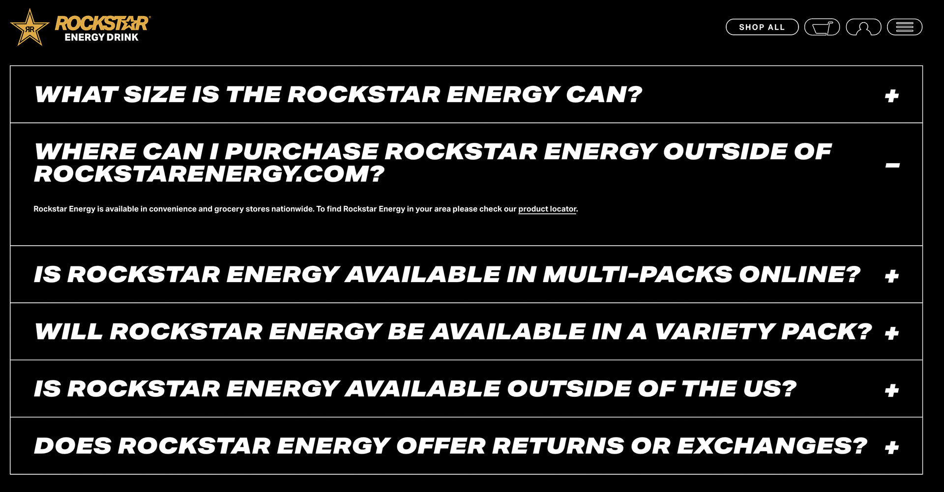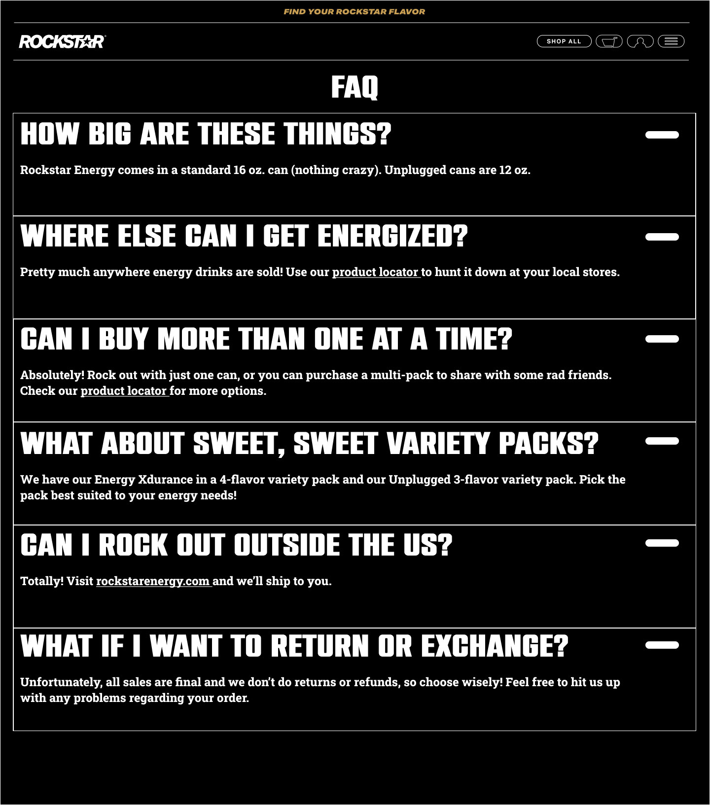 For this project, I wanted to rewrite a brand's copy on the FAQ page of their website to better fit the brand's tone and voice. I rewrote Rockstar Energy's page; I chose this because the brand's quirkiness in their package design and brand voice stuck out to me and I thought it could be an interesting challenge. My version is the top image and the original site's is the bottom image.